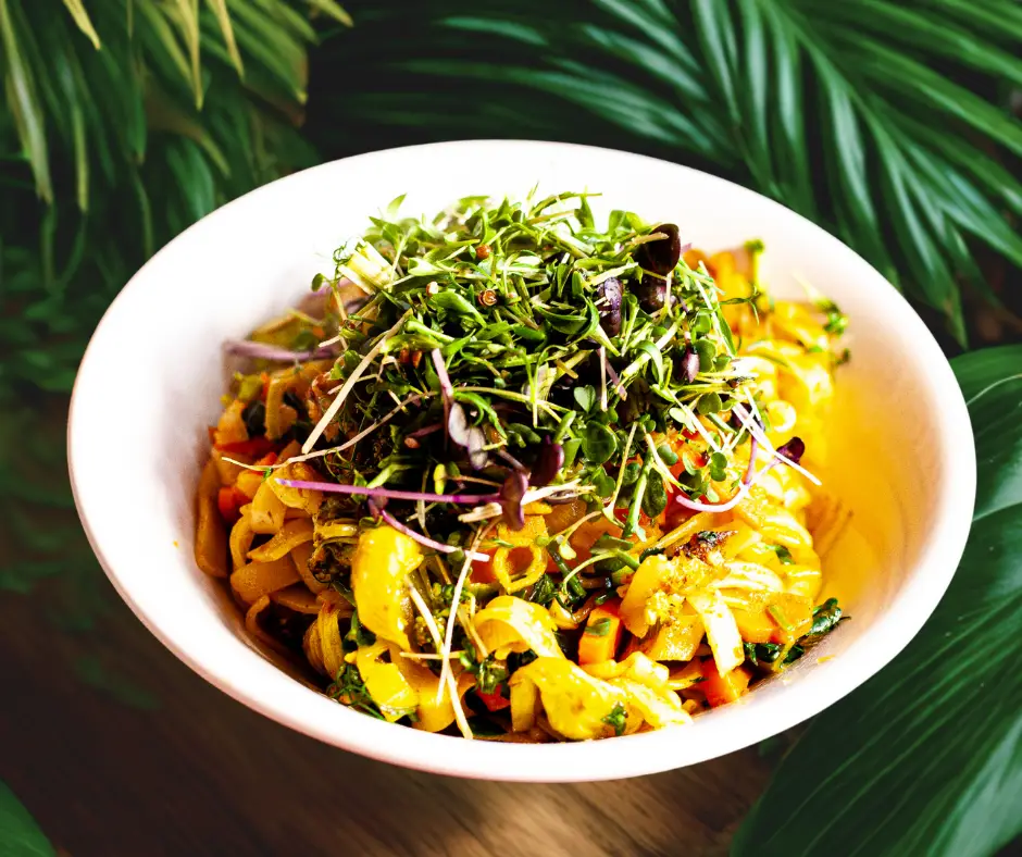 Nouilles de riz sautées, légumes de saison, noix de cajou torréfiées, sauce tamari-curry, micropousses fraîches et oignons croustillants.
