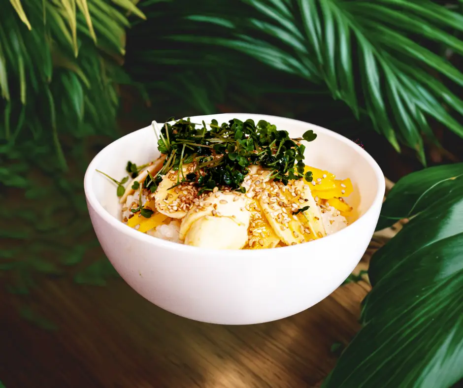 Avocat, mangue, gingembre, riz vinaigré, micropousses mixtes et de coriandre, oignons frits Exotique, parfumé, surprenant.